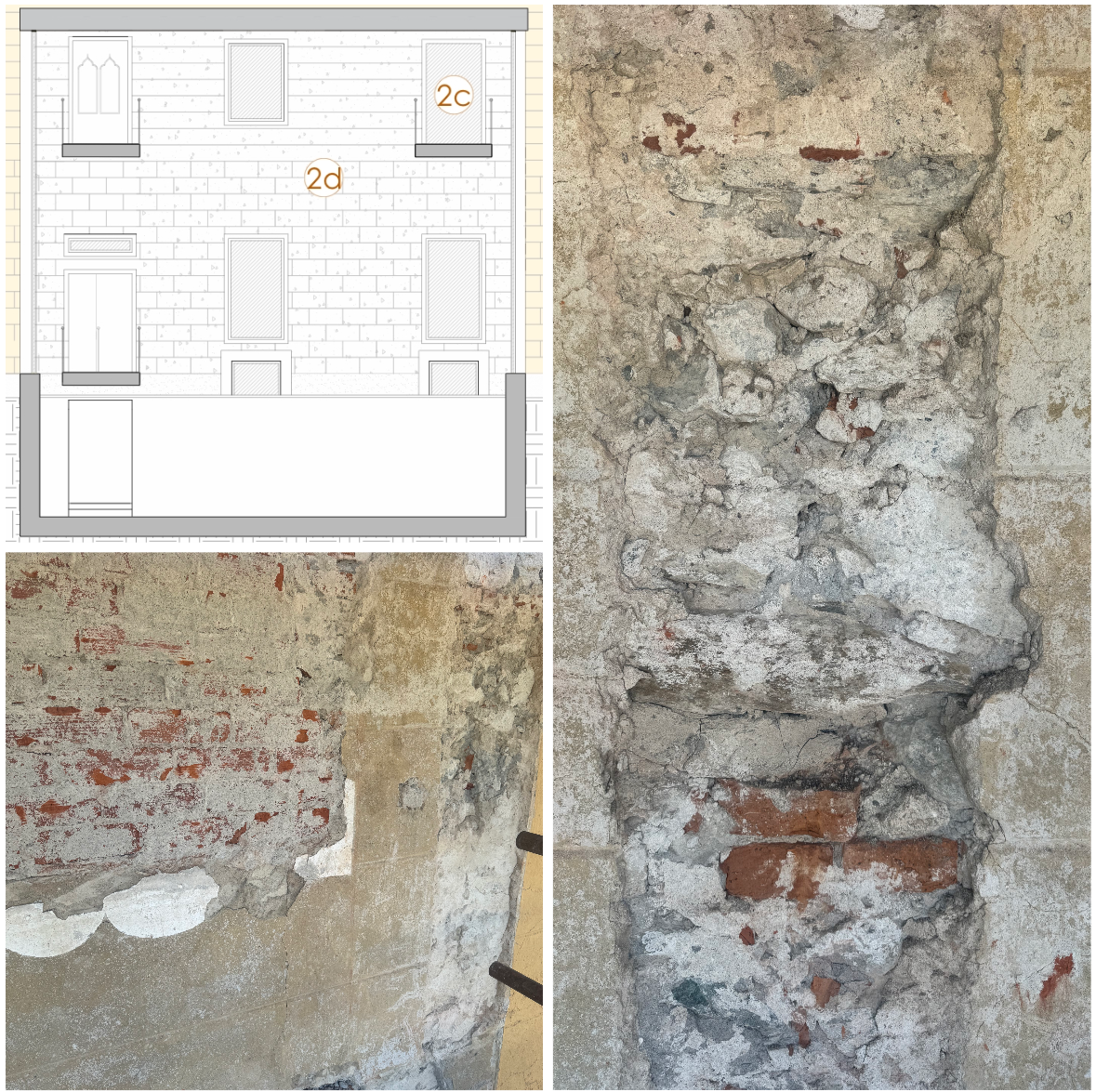 Sono in corso le operazioni di rimozione dello strato d'intonaco superficiale sintetico visibile fino ad arrivare allo strato del mattone bugnato riportando alla luce il prospetto originale dell'edificio storico lato ovest.