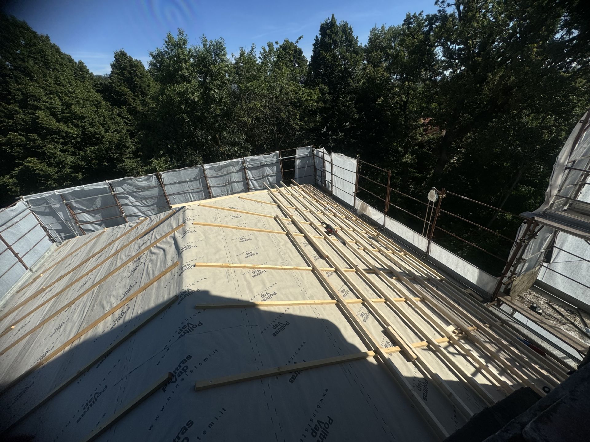 Oggi sono in corso i lavori di fissaggio della doppia listellatura in legno per la posa delle pietre del manto di copertura della villa storica.