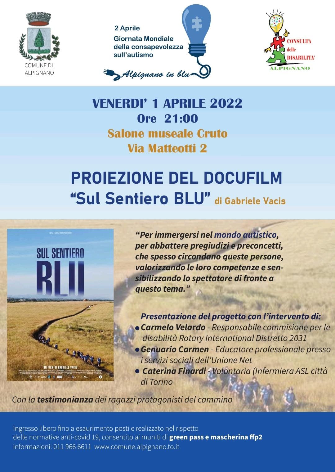 Per celebrare la Giornata Mondiale della consapevolezza sull'autismo è in programma la proiezione del docufilm “Sul sentiero blu” di Gabriele Vacis, venerdì 1 aprile, ore 21, presso il Salone Museale via Matteotti 2.