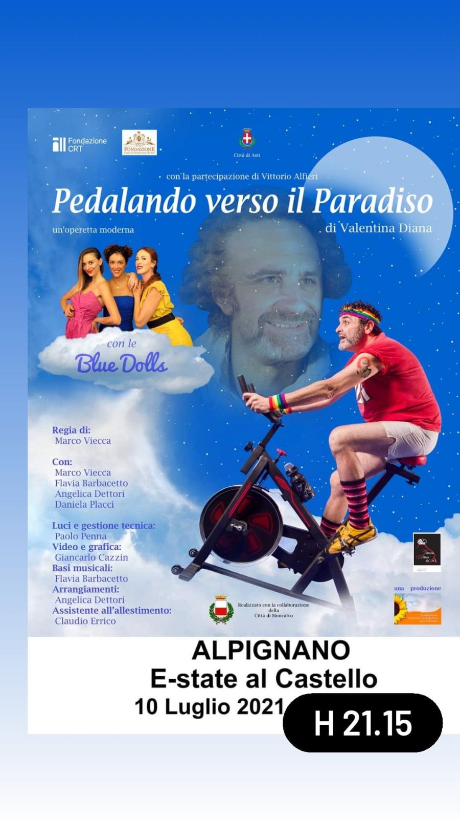 “Pedalando verso il paradiso” scritto dalla celebre drammaturga e romanziera Valentina Diana, diretto e interpretato da Marco Viecca con la partecipazione delle Blue Dolls, il noto trio musicale composto da Daniela Placci, Angelica Dettori e Flavia Barbacetto.
