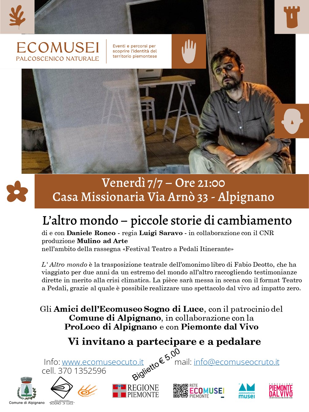 Siamo lieti di patrocinare e ospitare la proposta di: "Ecomusei Palcoscenico Naturale ", una rassegna di eventi, esperienze e approfondimenti per incentivare la scoperta degli Ecomusei piemontesi e del loro territorio, sviluppato grazie alla collaborazione tra Regione Piemonte, Fondazione Piemonte dal Vivo, Abbonamento Musei e Rete degli Ecomusei del Piemonte di cui il nostro Ecomuseo Sogno di Luce fa parte.