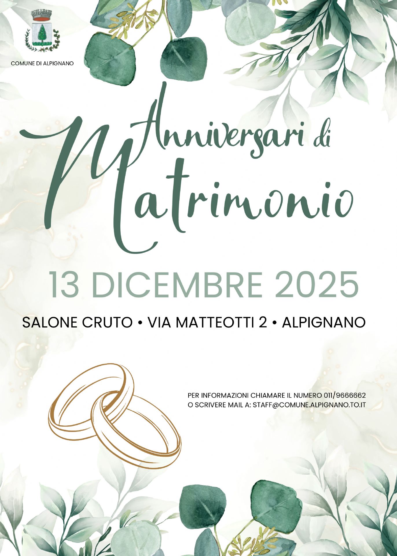 Il Comune di Alpignano è lieto di annunciare la tradizionale celebrazione degli Anniversari di Matrimonio dedicata alle coppie che festeggiano dai 50 ai 70 anni di vita insieme.