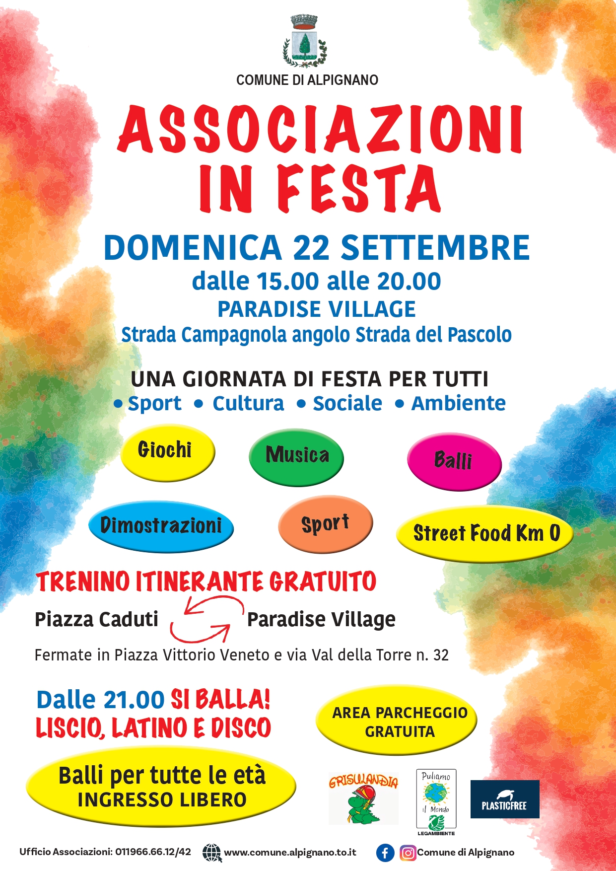 Torna l'appuntamento con la Festa delle Associazioni, domenica 22 settembre, al Paradise Village (ex impianto sportivo Borello) una splendida location immersa nel verde, in Strada Campagnola angolo Strada del Pascolo.