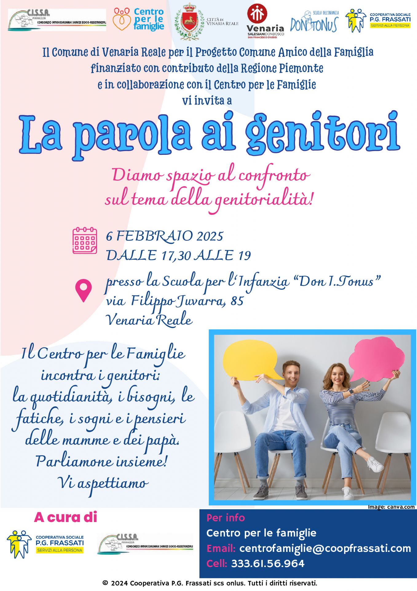 Il Centro per le Famiglie, in collaborazione con il CISSA, organizza giovedì 6 FEBBRAIO 2025 DALLE 17,30 ALLE 19 un incontro sul tema della genitorialità, presso la Scuola per l’Infanzia “Don Tonus”, Via Filippo Juvarra, 85 , Venaria Reale.