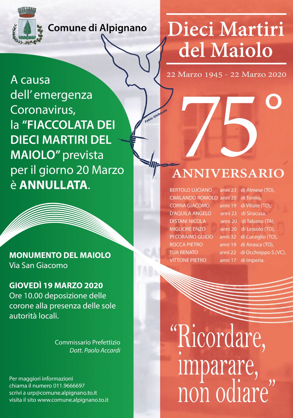 VISTO LO STATO DI EMERGENZA PER IL CONTENIMENTO E IL CONTRASTO DEL DIFFONDERSI DEL VIRUS COVID-19 LA COMMEMORAZIONE DEI DIECI MARTIRI DEL MAIOLO PREVISTA PER IL 20 MARZO E' ANNULLATA .