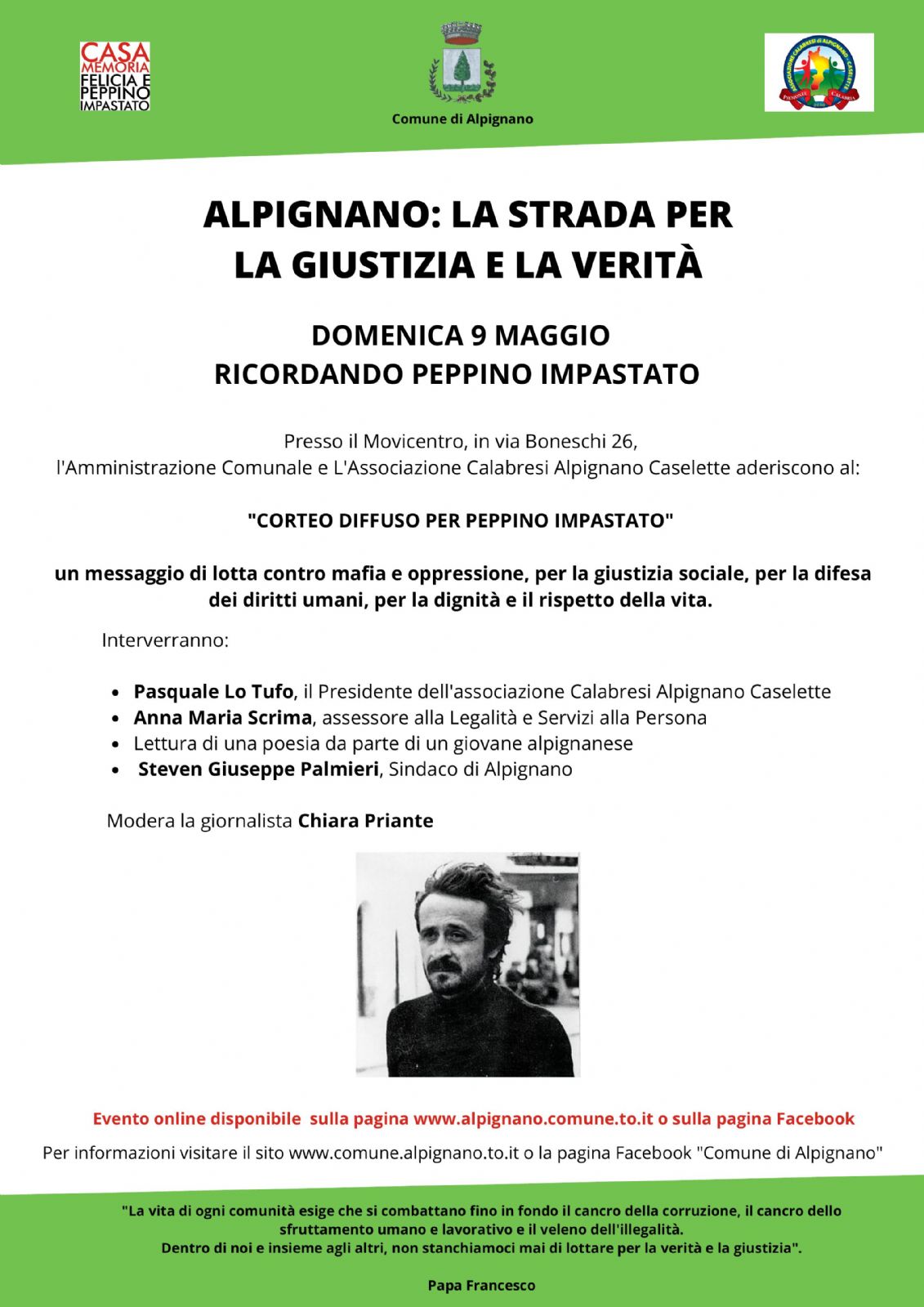Il Comune di Alpignano e l'Associazione Calabresi Alpignano Caselette aderiscono al “Corteo diffuso per Peppino Impastato” - Domenica 9 maggio 2021 - per dire ancora "Con idee e il coraggio di Peppino noi continuiamo".