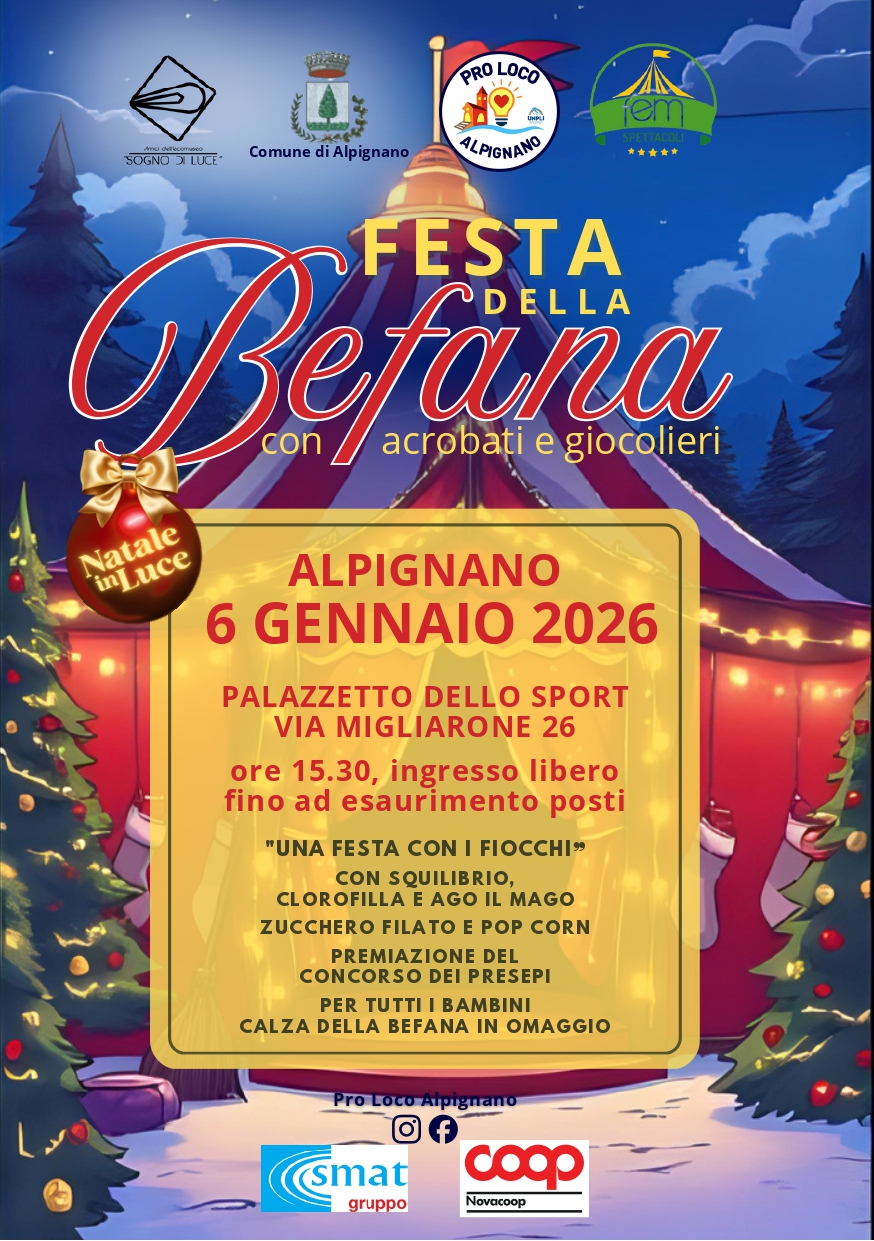 Martedì 6 gennaio una straordinaria festa per tutti i bambini: l'appuntamento è fissato per le ore 15:30 presso il palazzetto dello sport in via Migliarone 26 Alpignano.