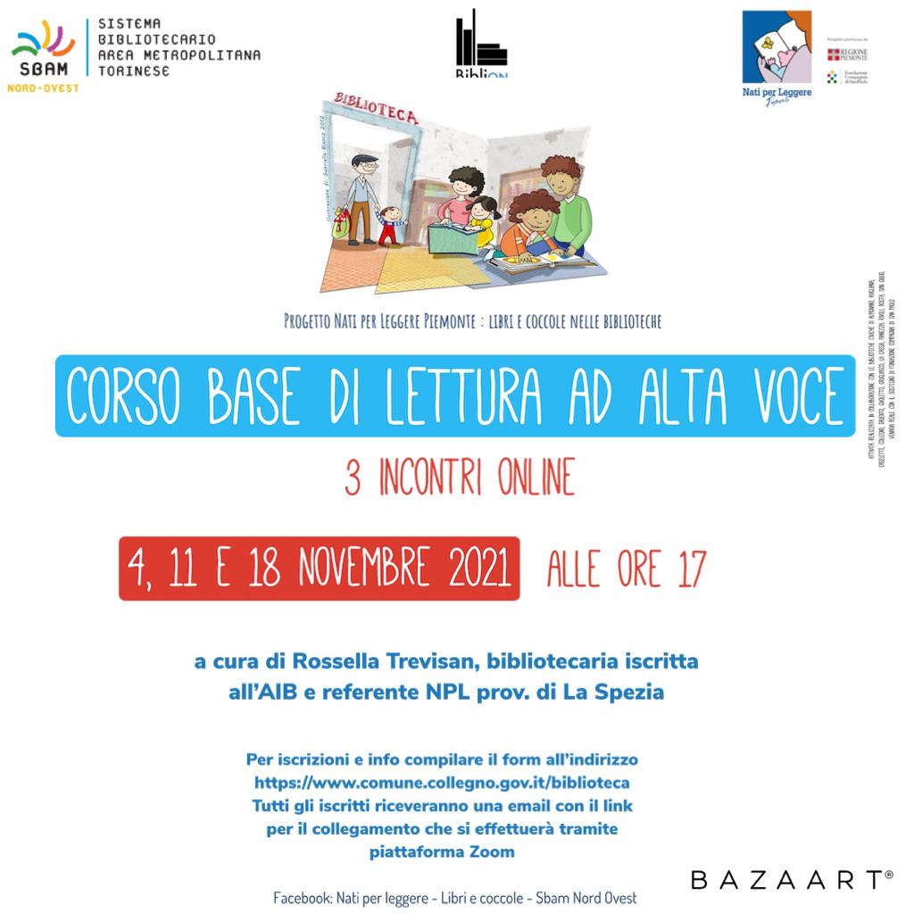 Nell'ambito del progetto "Nati per leggere" le biblioteche dell'Area Nord Ovest del Sistema Bibliotecario dell'Area Metropolitana (SBAM) hanno organizzato un corso base online di lettura ad alta voce, rivolto a genitori, educatori, volontari e bibliotecari, a cura di Rossella Trevisan - bibliotecaria iscritta all'AIB e referente NpL provincia di La Spezia; il corso si articola in tre giornate, 4 - 11 e 18 novembre 2021 dalle ore 17 alle ore 19 in modalità online.