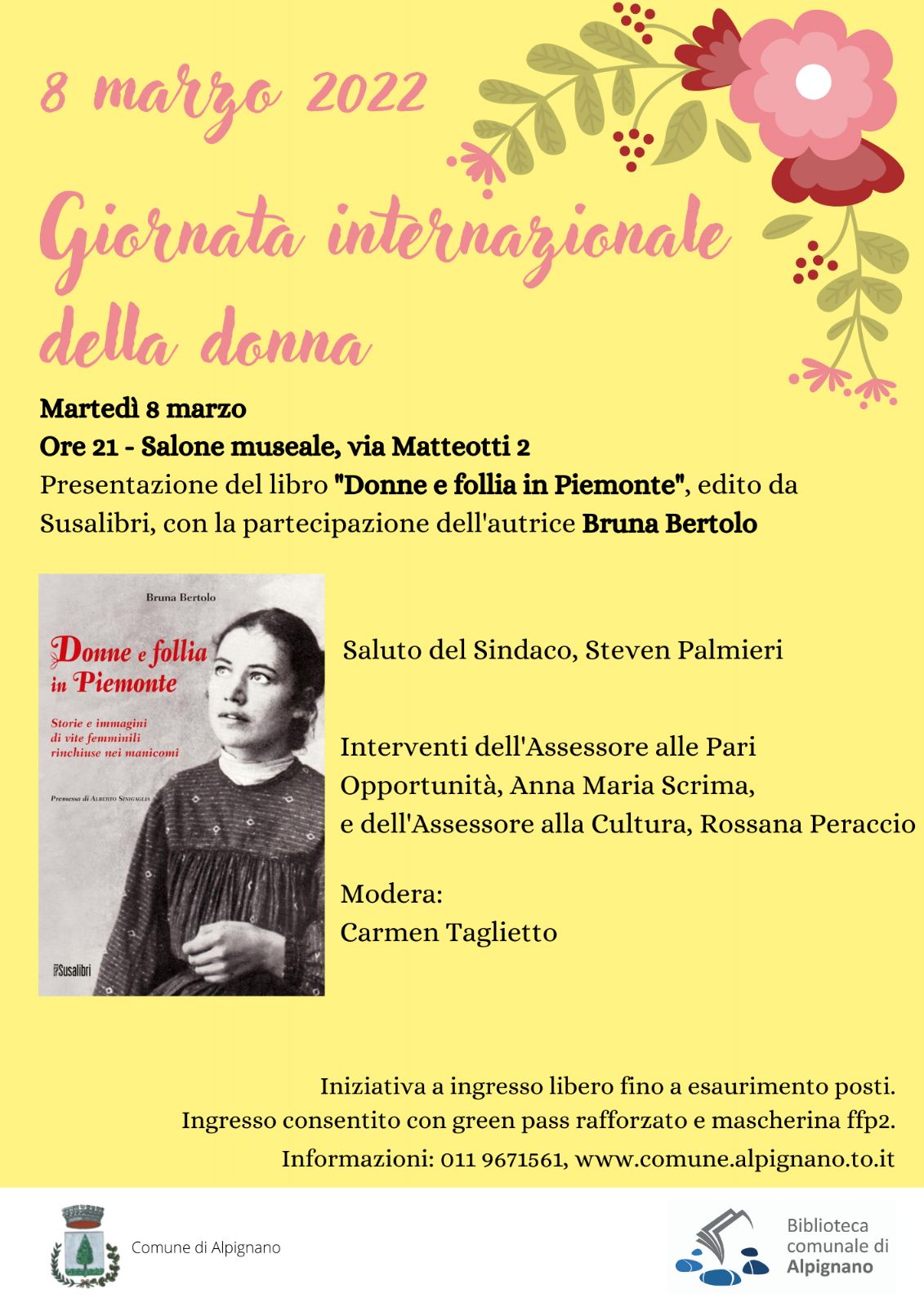 Appuntamento a martedì 8 marzo, alle ore 21, presso il Salone museale via Matteotti 2. La serata sarà moderata da Carmen Taglietto.