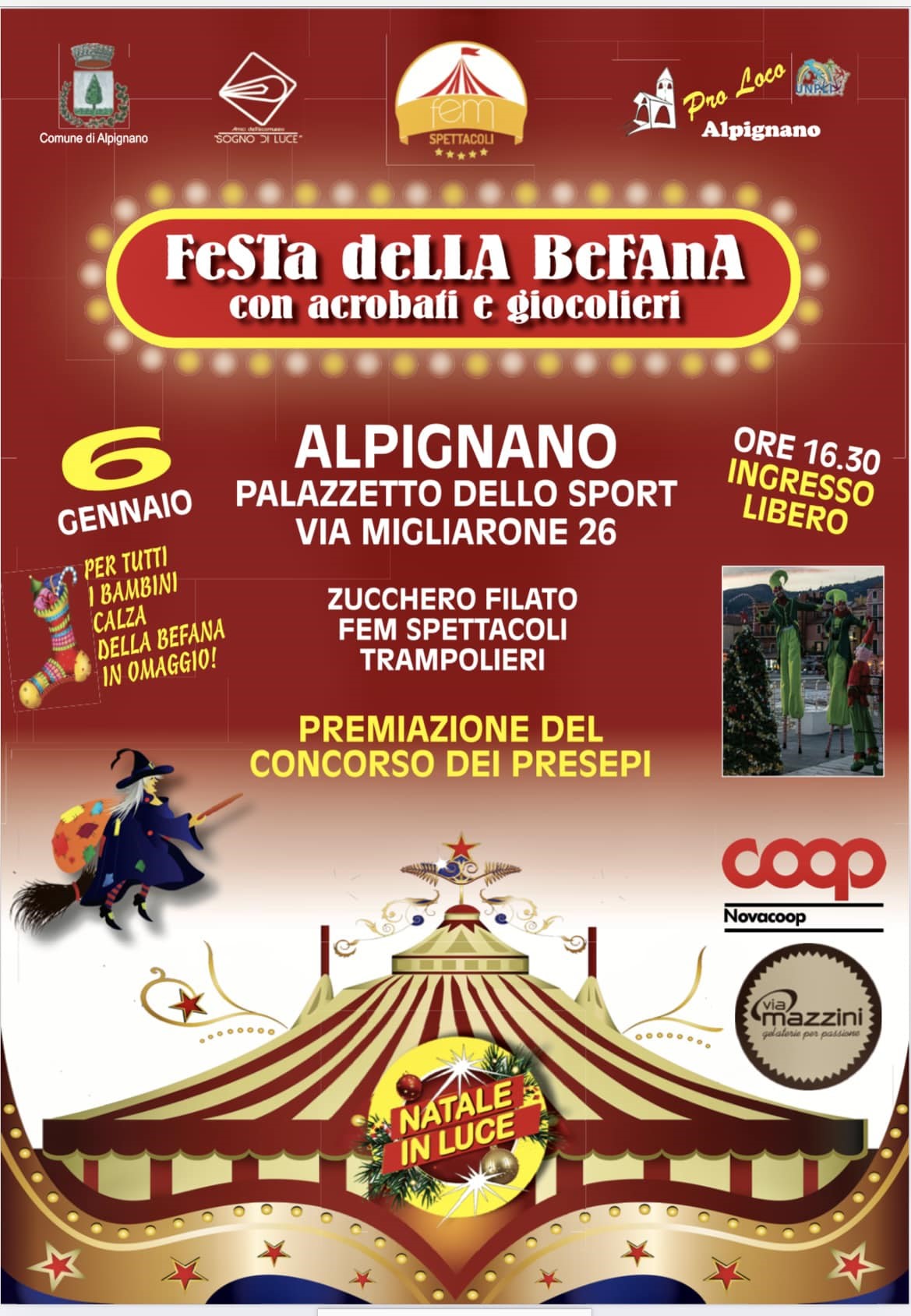 Per concludere il periodo delle festività, il giorno 6 gennaio verrà proposto un pomeriggio dedicato alla festa della befana e alla premiazione del concorso presepi con inizio intorno alle ore 16.30 al Palazzetto dello Sport di via Migliarone ad Alpignano, un evento della Pro Loco per far divertire i bambini e le famiglie e per augurare ai cittadini Buona Befana con uno spettacolo circense di alto livello. Ci saranno infatti giocolieri acrobati e trampolieri di FEM Spettacoli con una animazione speciale in onore della cara e vecchia Befana.