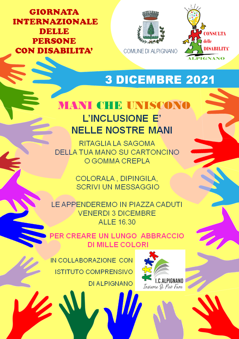 "Mani che uniscono - l'inclusione nelle nostre mani" ambisce proprio a questo, i bambini potranno ritagliare la sagoma delle proprie mani e renderle uniche, affidandogli un messaggio o colorandola. Le mani dei bambini verranno appese intorno alla Cappella dei Caduti il giorno 3 dicembre, per creare un lungo abbraccio di mille colori.