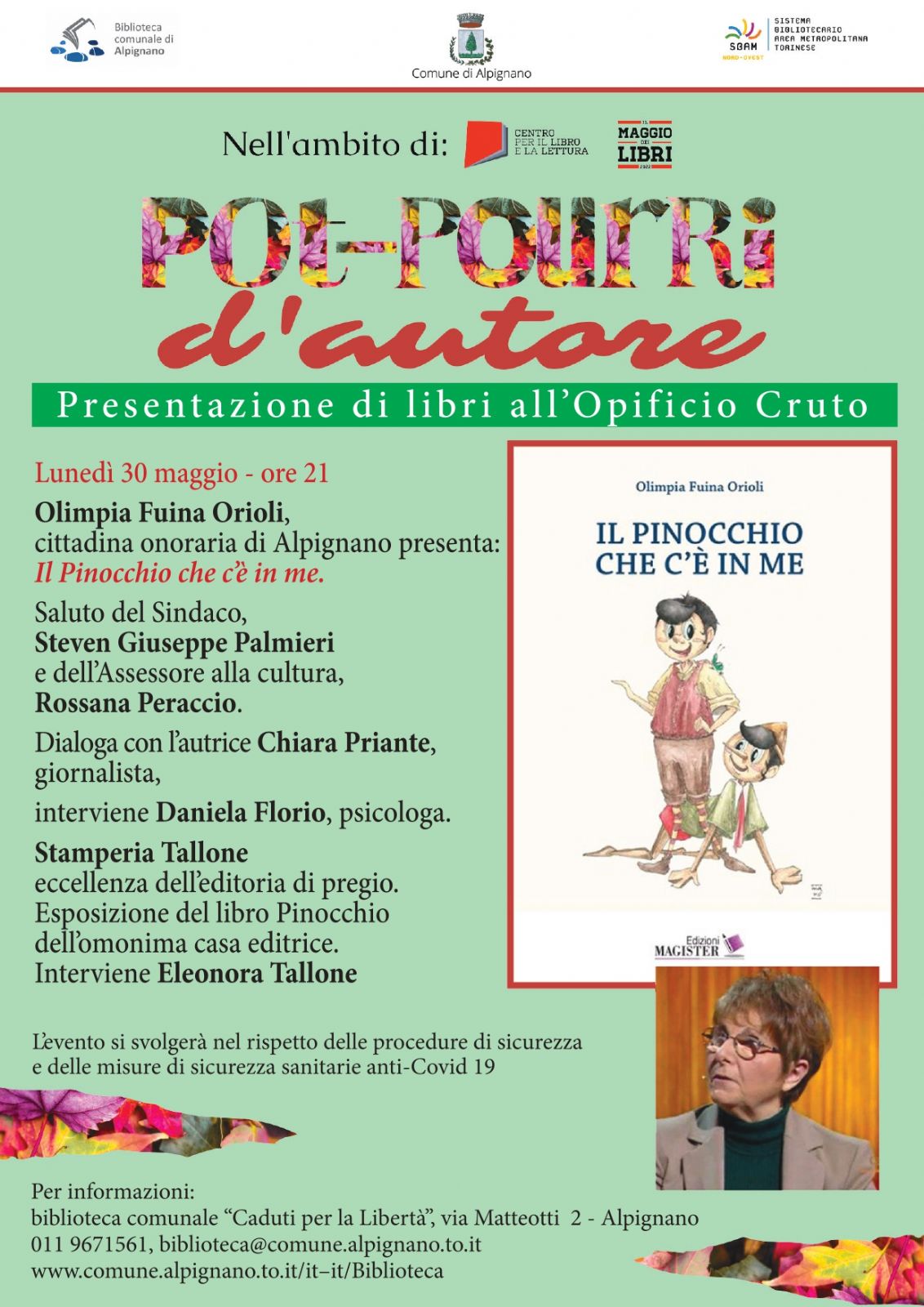 Sarà Olimpia Fuina Orioli, cittadina onoraria di Alpignano, a chiudere la rassegna "Pot-Pourri d'autore", con la presentazione della sua ultima creazione "Il Pinocchio che c'è in me".