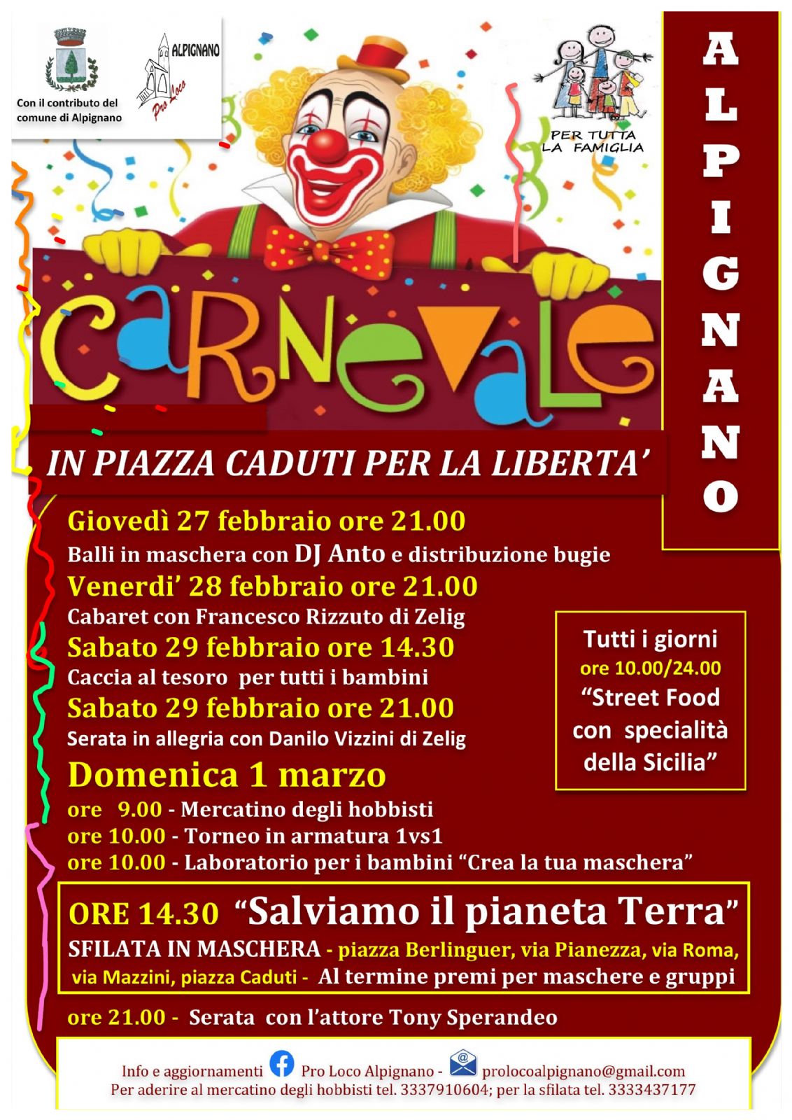 La Pro Loco Alpignano organizza il Carnevale alpignanese: Street Food con specialità della Sicilia, balli in maschera, cabaret, laboratori, mercatino e la sfilata in maschera.