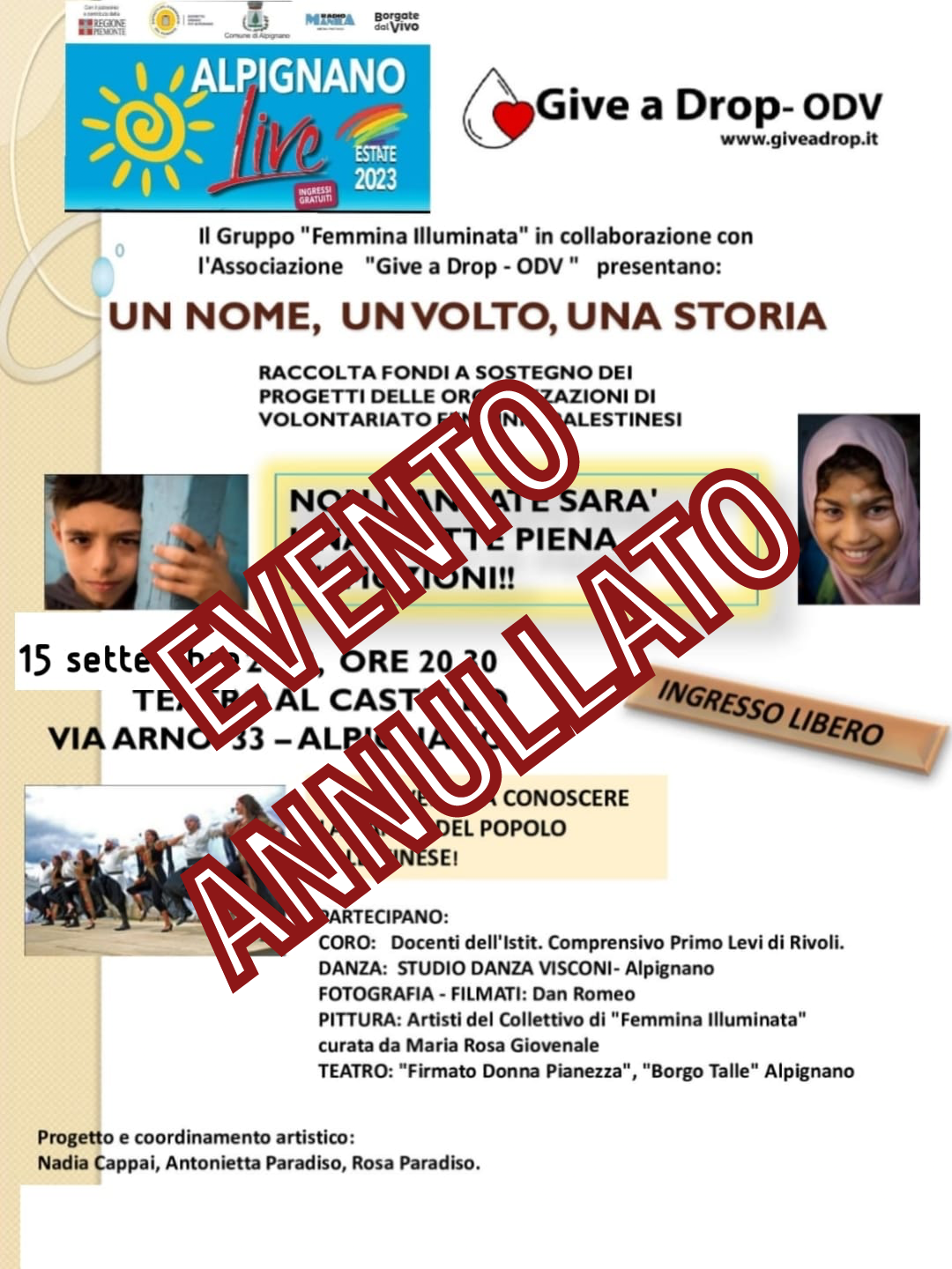 Lo spettacolo teatrale "Un nome, un volto, una storia" presentato dal Gruppo Femmina Illuminata in collaborazione con l'associazione "Give a Drop OSV", incluso nel cartellone "Alpignano Live" del Comune di Alpignano, verrà riproposto venerdì 15 settembre, a partire dalle 20.30, presso il cortile di Via Arnò 33.