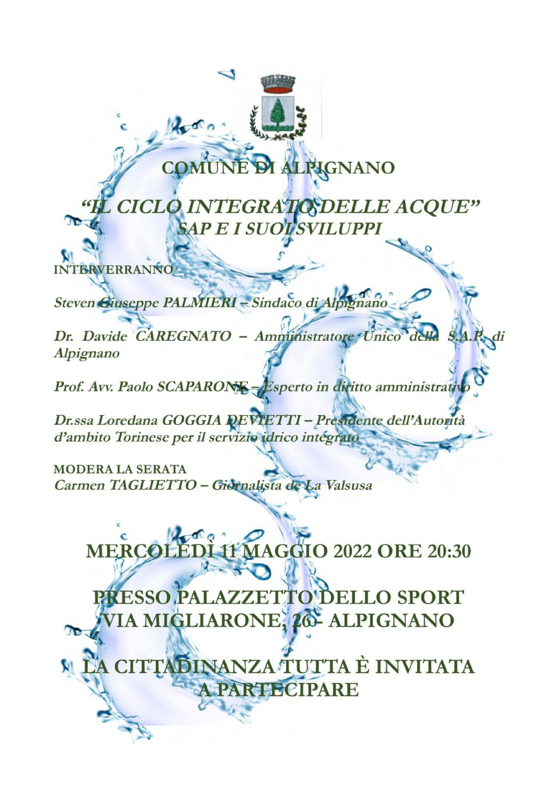 LA CITTADINANZA E' INVITATA A PARTECIPARE ALL'INCONTRO “IL CICLO INTEGRATO DELLE ACQUE SAP E I SUOI SVILUPPI” IL GIORNO MERCOLEDI' 11 MAGGIO 2022 ALLE ORE 20,30 PRESSO IL PALAZZETTO DELLO SPORT VIA MIGLIARONE – 26
