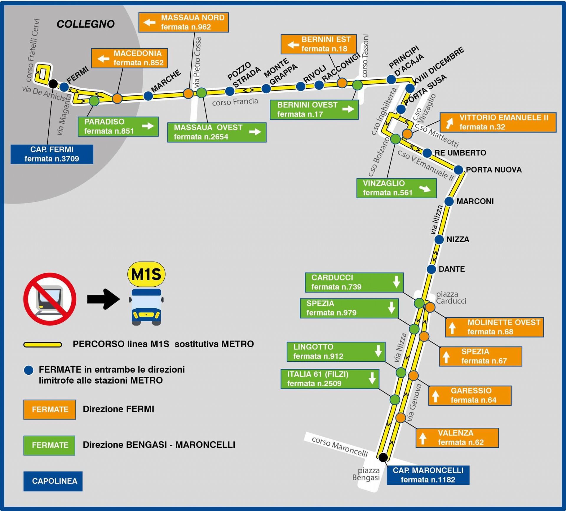 La linea M1S effettuerà fermate limitrofe alle stazioni metro in entrambe le direzioni, da Bengasi (Fermata 1182 MARONCELLI CAP) a Fermi (Fermata 3709 FERMI CAP).
