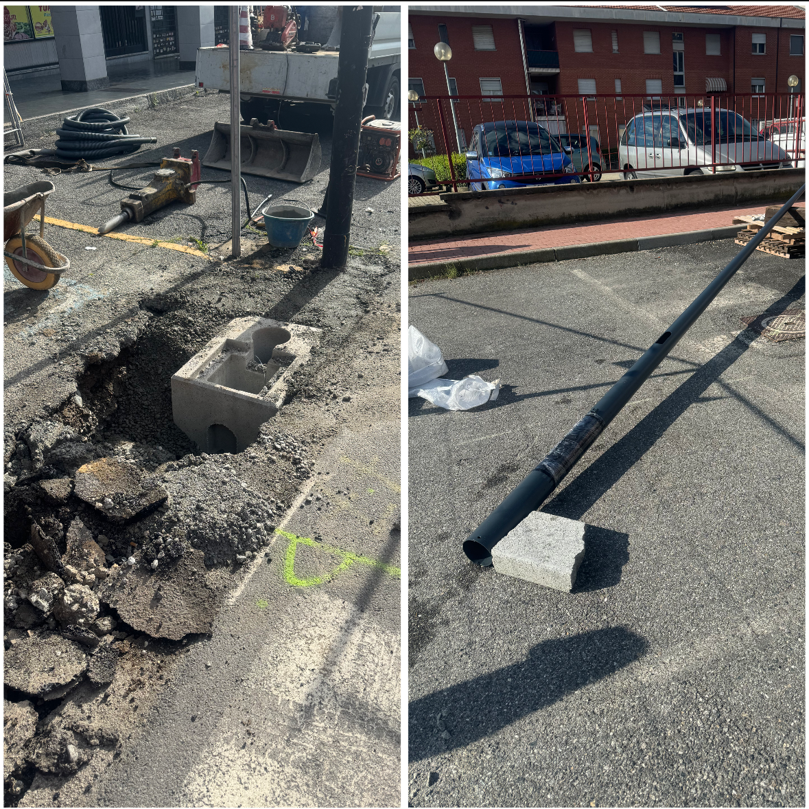 Oggi sono in corso le lavorazioni per la posa dei basamenti per i pali dell'illuminazione degli attraversamenti pedonali in via Cavour.