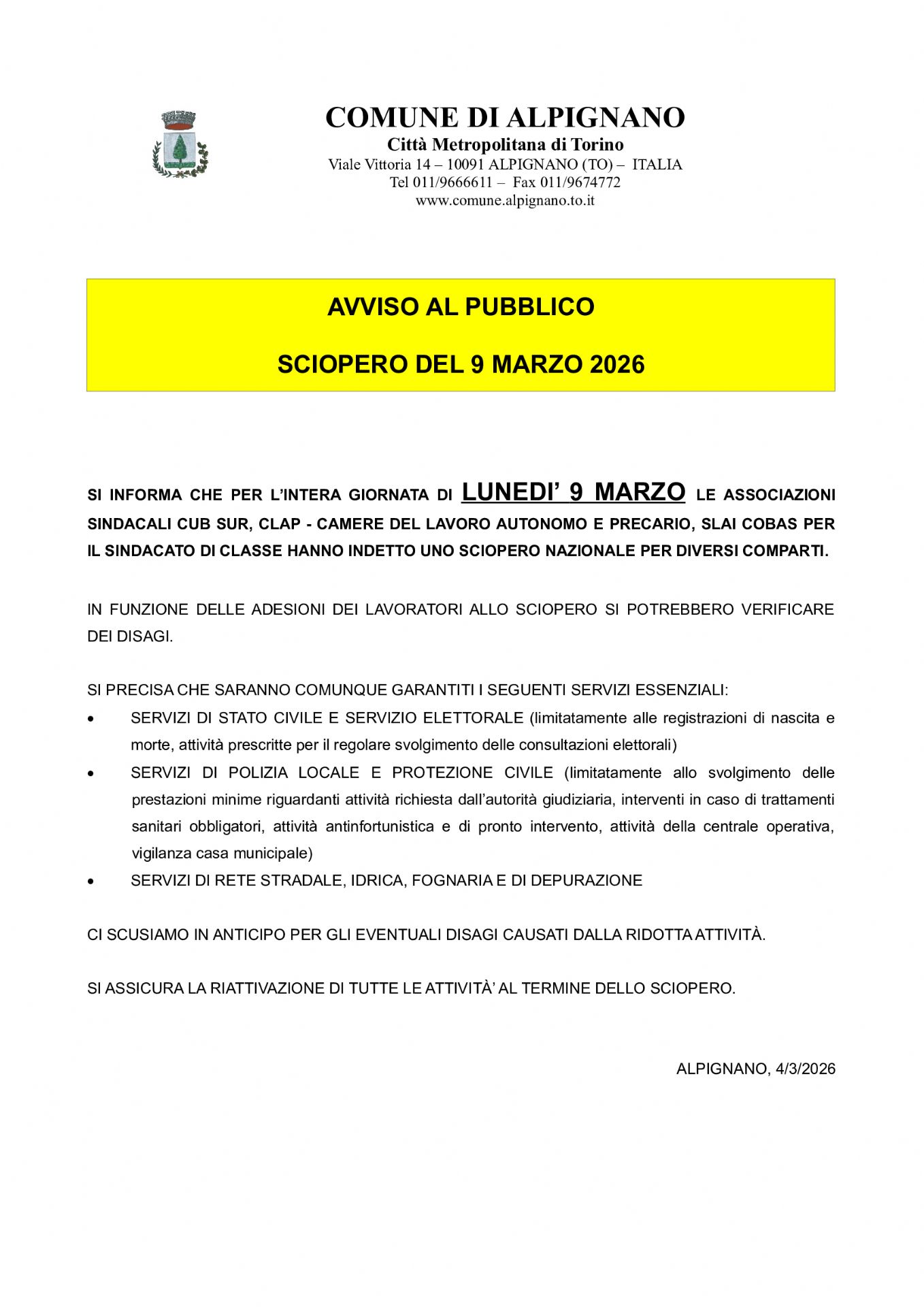 Si informa che per l'intera giornata di lunedì 9 marzo le associazioni sindacali CUB SUR, CLAP - camere del lavoro autonomo e precario, SLAI COBAS per il sindacato di classe, hanno indetto uno sciopero nazionale per diversi comparti