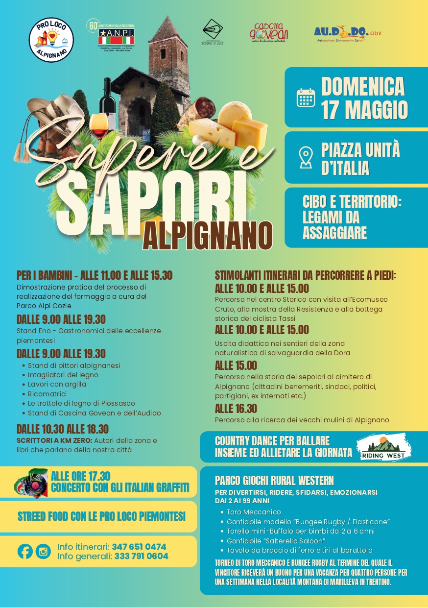 - "i saperi" (itinerari da percorrere a piedi per conoscere le peculiarità del territorio: Ecomuseo Sogno di Luce, mostra Resistenza, bottega storica del ciclista Tassi, storia dei sepolcri, sentieri della zona naturalistica di salvaguardia della Dora e alla ricerca dei vecchi mulini);